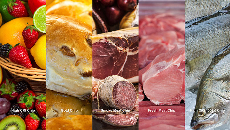 Für bestimmte Lebensmittelgruppen wie Wurst, Fleisch, Fisch, Obst, Gemüse oder Backwaren werden auch extra konzipierte LED Spezial Chips in den Lichtfarben Fresh Meat, Smoke Meat und Gold eingesetzt.